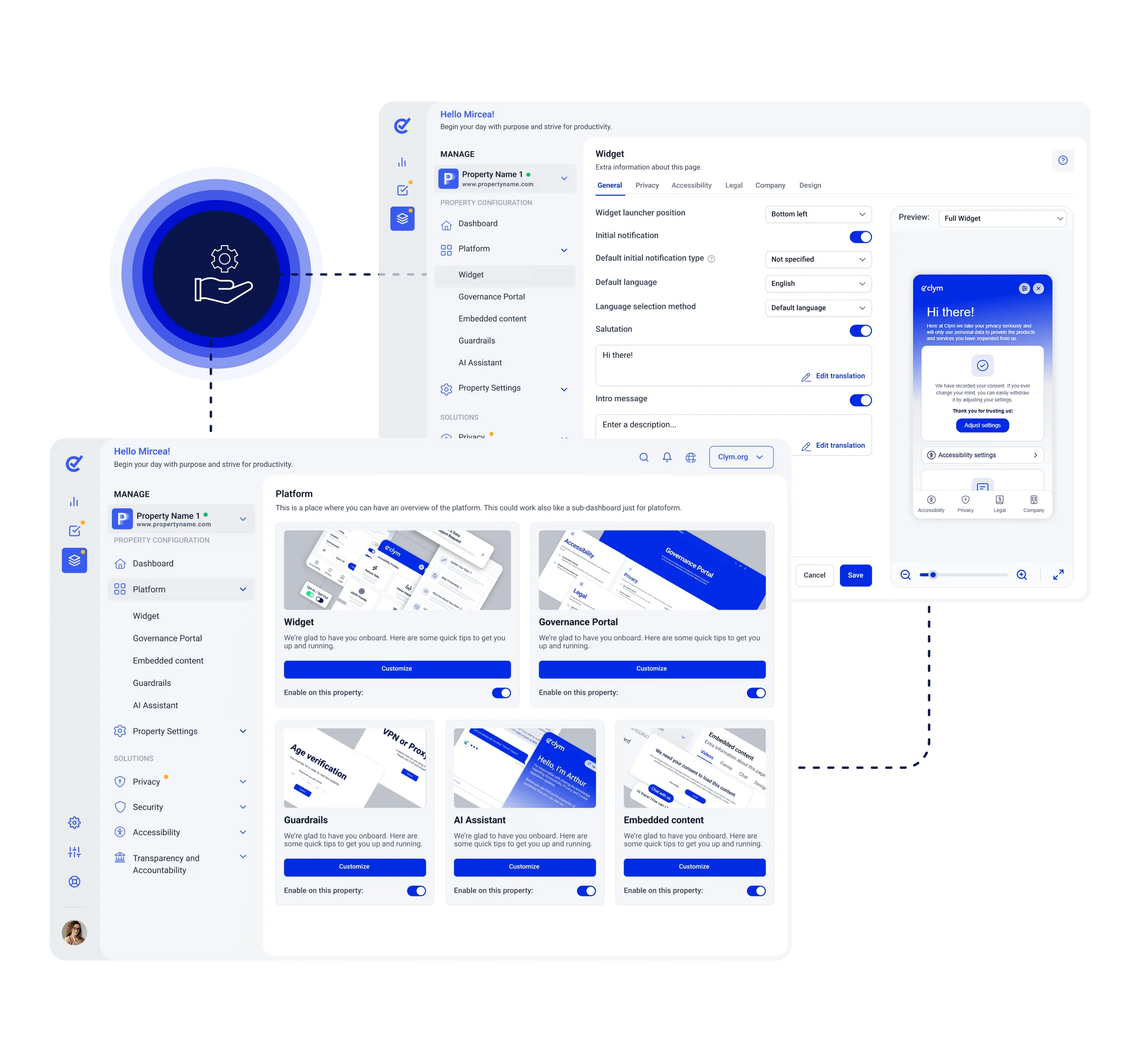- Privacy and accessibility configuration: Manage privacy and accessibility-related settings in structured, regulation-specific sections